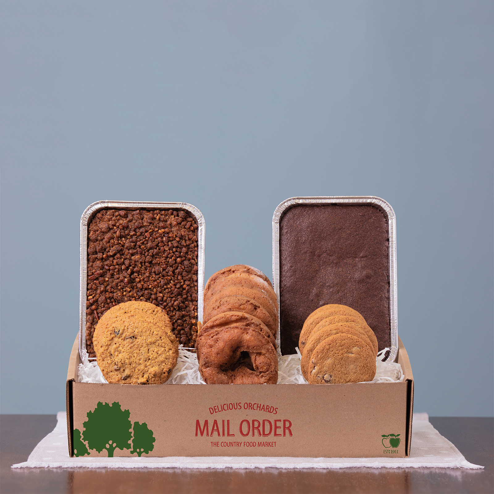 We’ll also include a 16 oz tin of our brownies and a 15 oz tin of our Apple Crumb cake made with fresh apples.